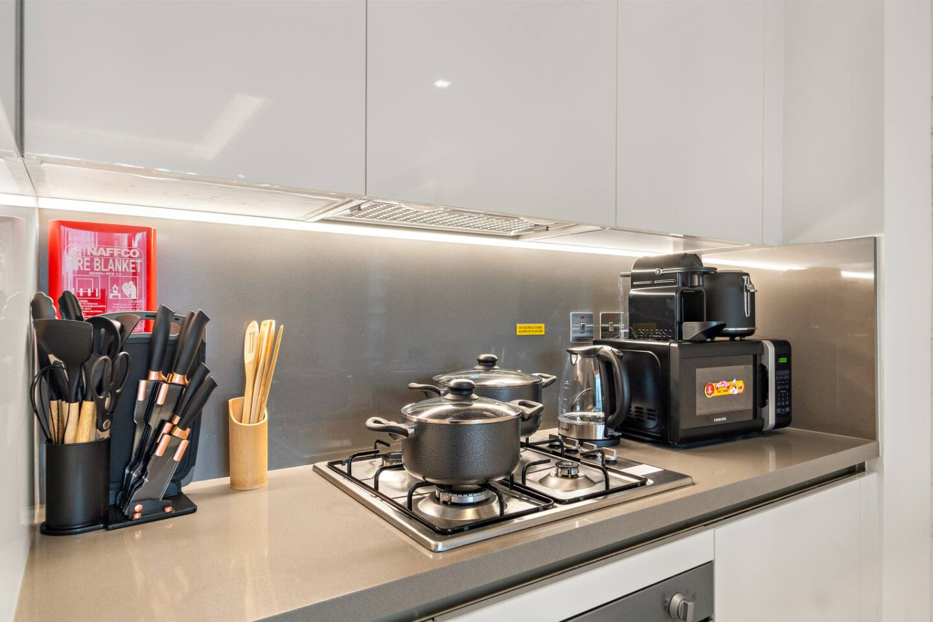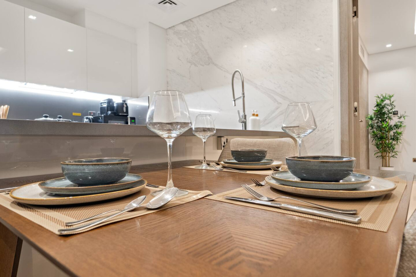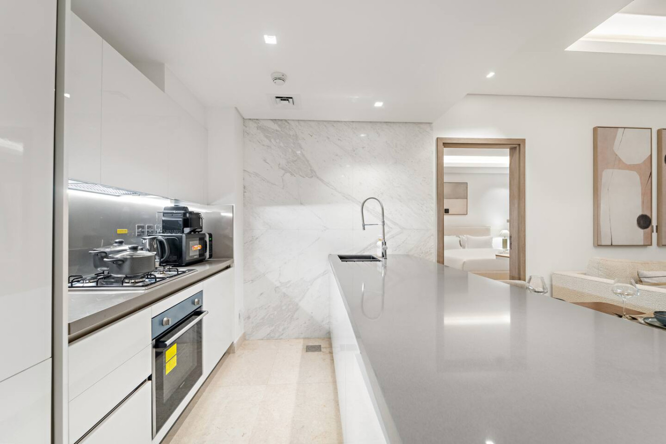 It is fully equipped with stainless-steel cooking appliances that make it suitable for preparing any meal, whether a simple breakfast, quick snack or a three-course gourmet dinner. Spacious quartz countertops and a central kitchen island provide plenty of room to work your MasterChef magic.