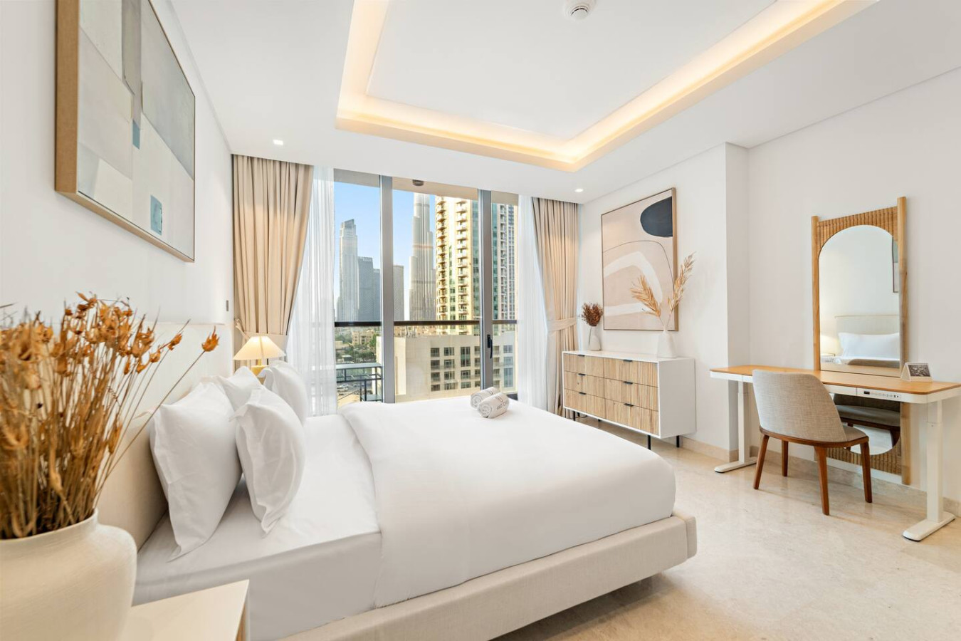 791.16 per nightStay in a modern & stylish 1BR with Burj Khalifa views from the balcony 🏙️. Just walk from Dubai Mall, Burj Khalifa, and top restaurants 🍽️. Thoughtfully designed for comfort & relaxation, this peaceful retreat blends modern design with everyday convenience. Perfect for couples or business travelers seeking a stylish and comfortable Downtown stay 🛋️✨