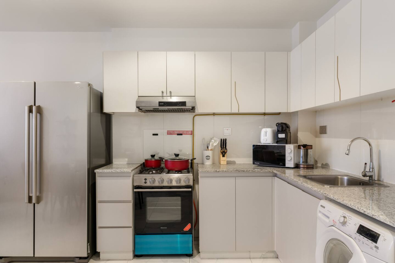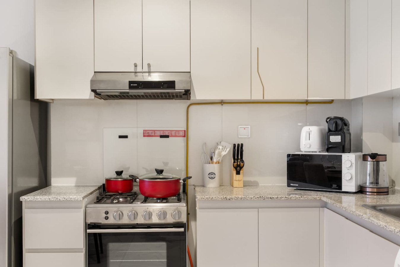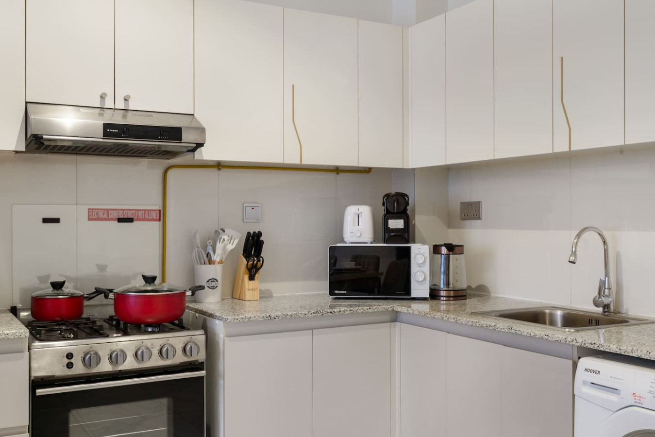 It is fully equipped with stainless-steel cooking appliances that make it suitable for preparing any meal, whether a simple breakfast, quick snack or a three-course gourmet dinner. Spacious quartz countertops and a central kitchen island provide plenty of room to work your MasterChef magic.
