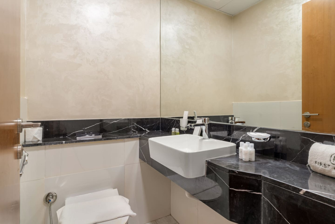 The bathroom is stocked with fresh towels and essential toiletries, so you don’t have to worry about bringing your own.