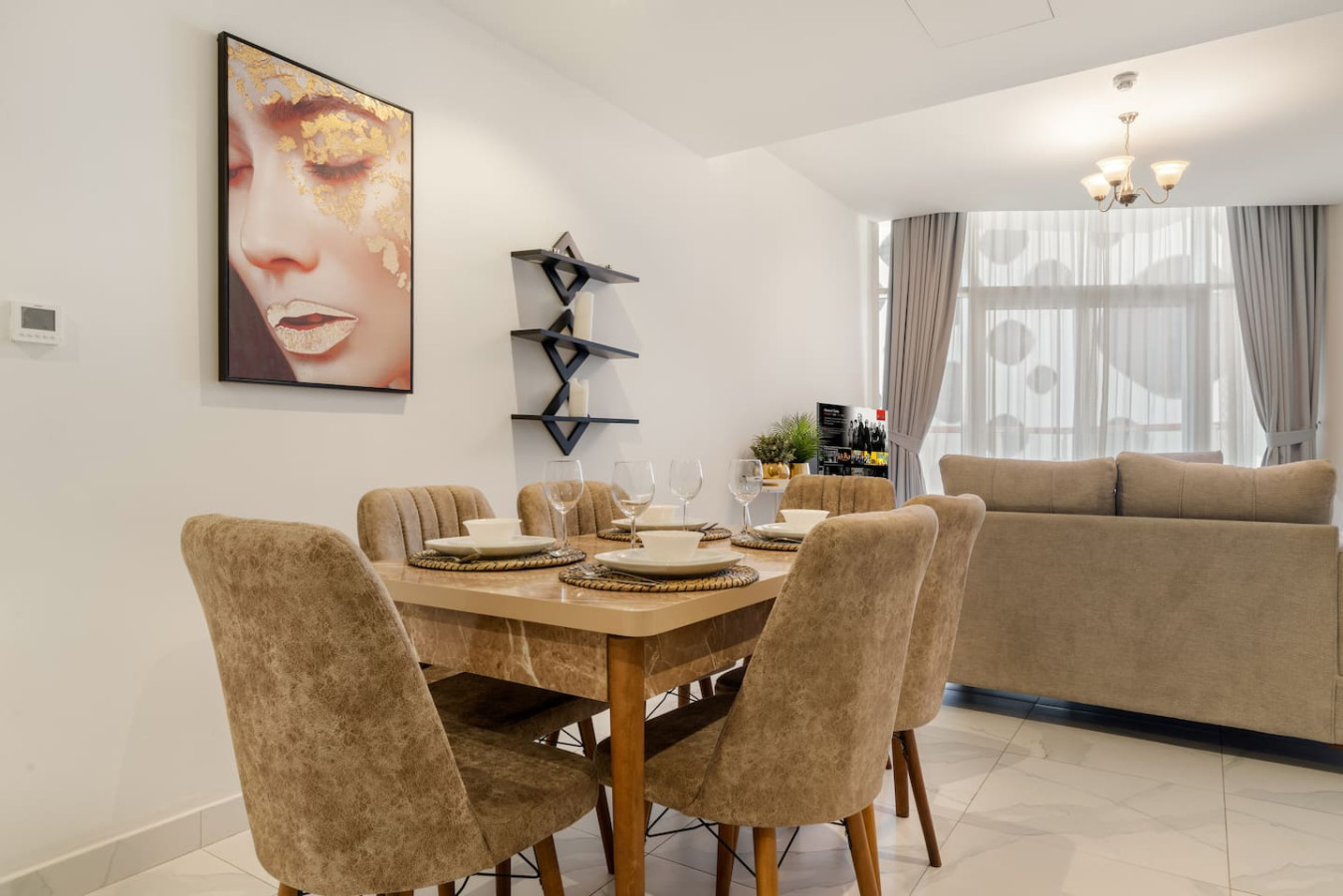 Have a few drinks in the living room while the food is getting ready. Once it’s done, serve it at the inviting dining table and enjoy a tasty meal with your loved ones.