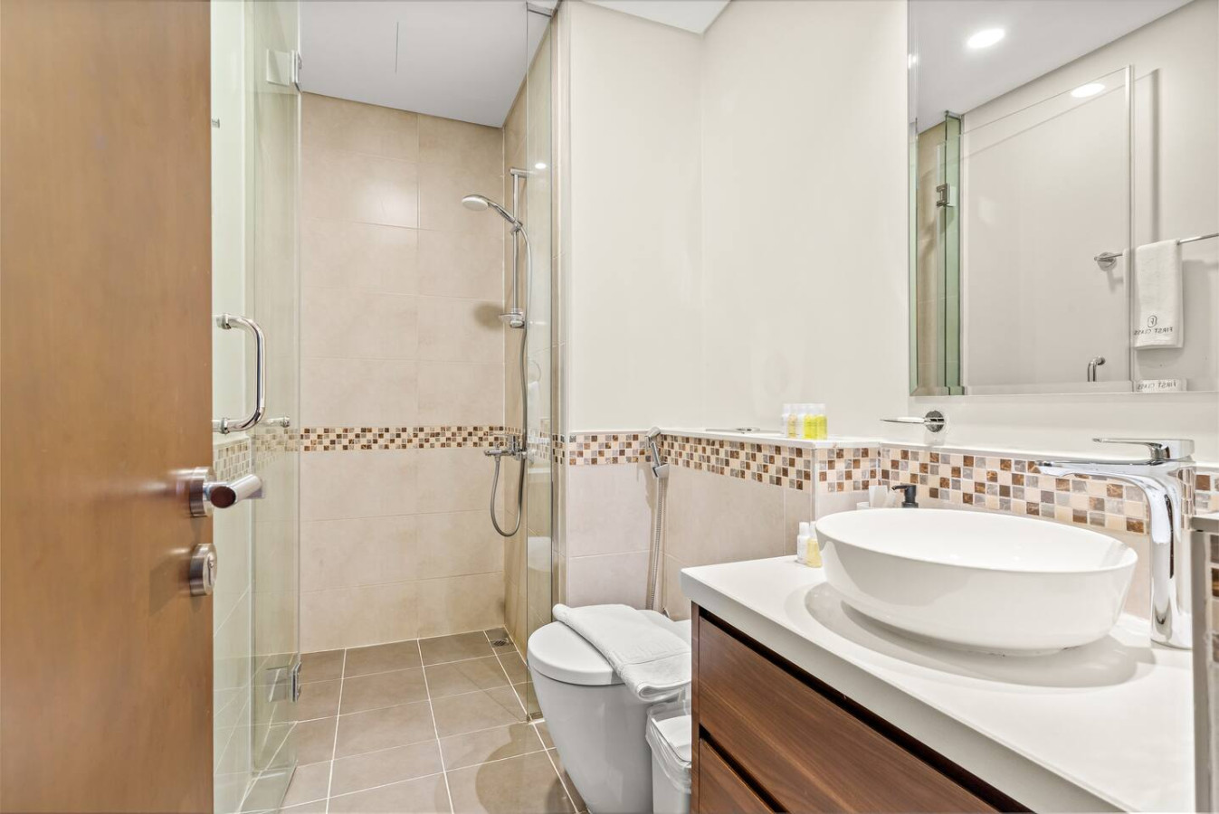 The bathroom is stocked with fresh towels and essential toiletries, so you don’t have to worry about bringing your own.