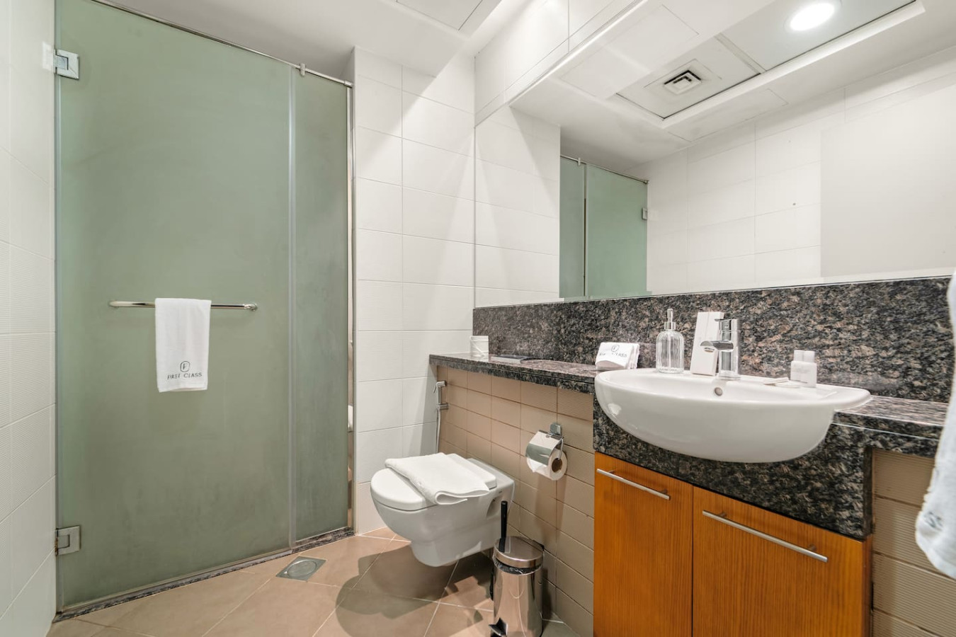 The bathroom is stocked with fresh towels and essential toiletries, so you don’t have to worry about bringing your own.