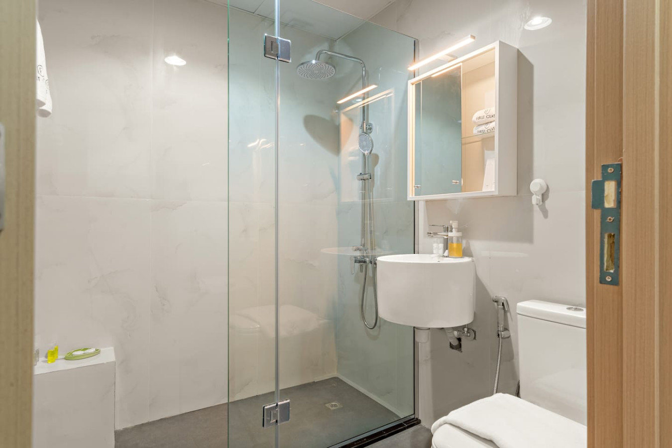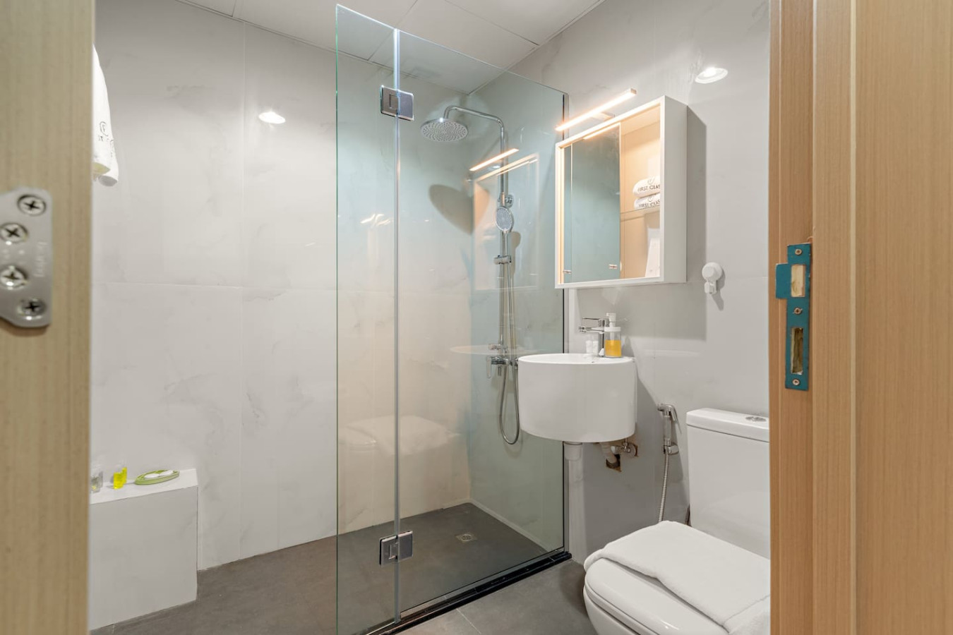 The bathroom is stocked with fresh towels and essential toiletries, so you don’t have to worry about bringing your own.