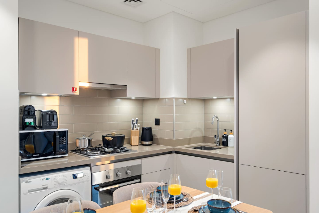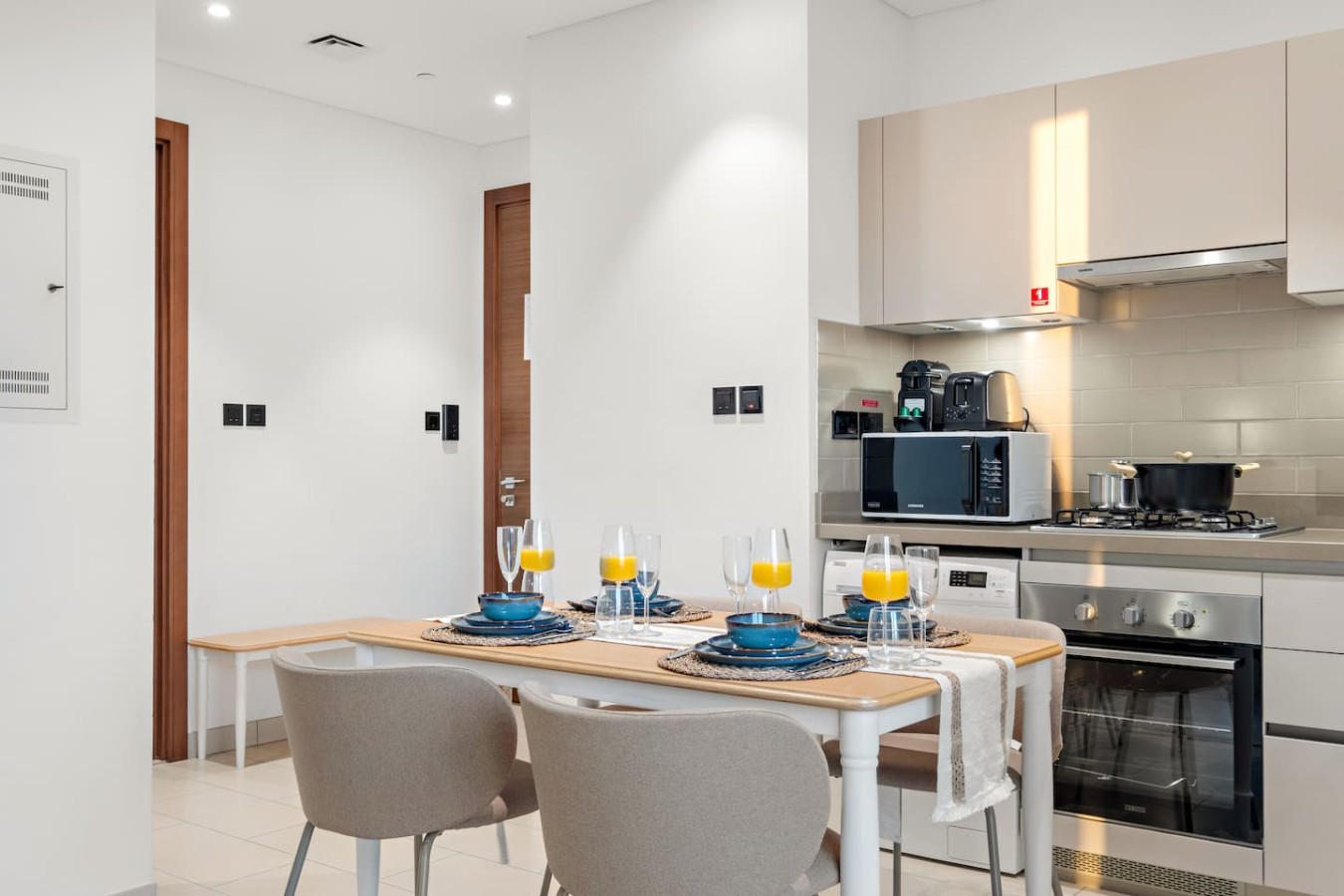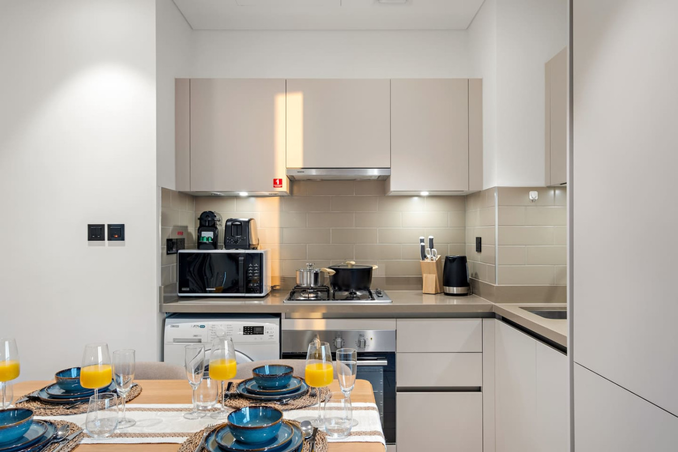 It is fully equipped with stainless-steel cooking appliances that make it suitable for preparing any meal, whether a simple breakfast, quick snack or a three-course gourmet dinner. Spacious quartz countertops and a central kitchen island provide plenty of room to work your MasterChef magic.