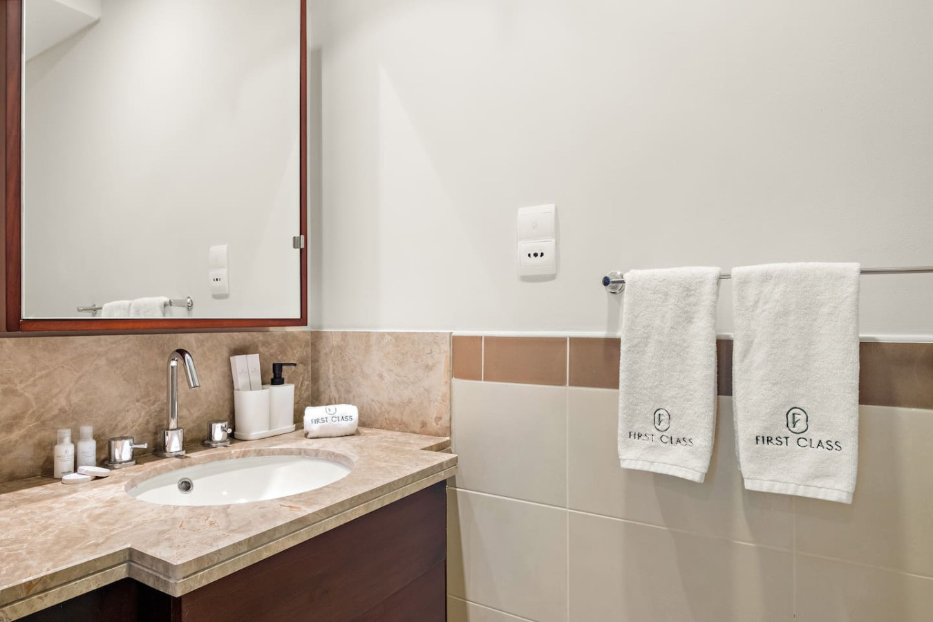 The bathroom is stocked with fresh towels and essential toiletries, so you don’t have to worry about bringing your own.