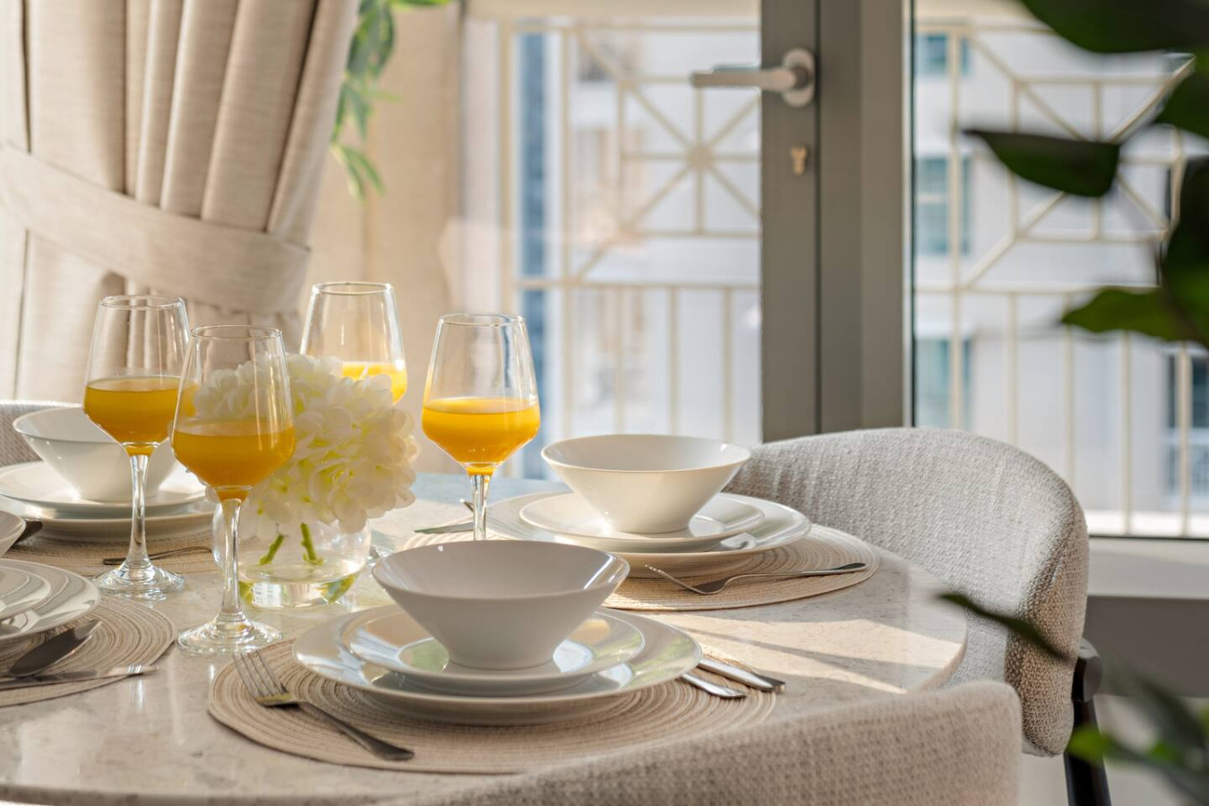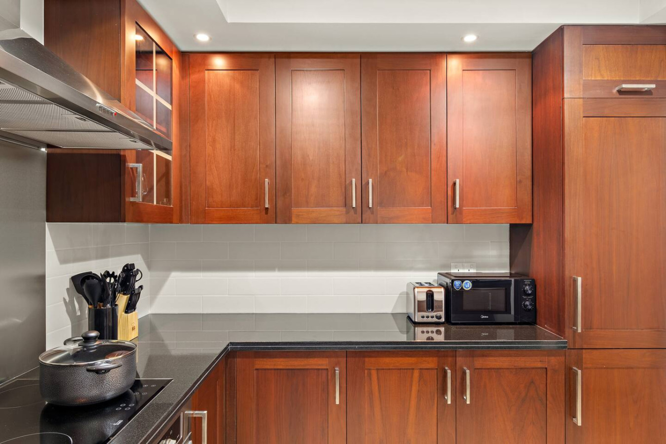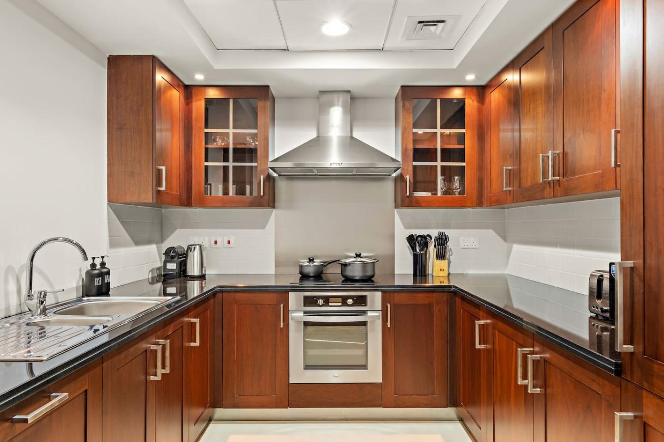 It is fully equipped with stainless-steel cooking appliances that make it suitable for preparing any meal, whether a simple breakfast, quick snack or a three-course gourmet dinner. Spacious quartz countertops and a central kitchen island provide plenty of room to work your MasterChef magic.