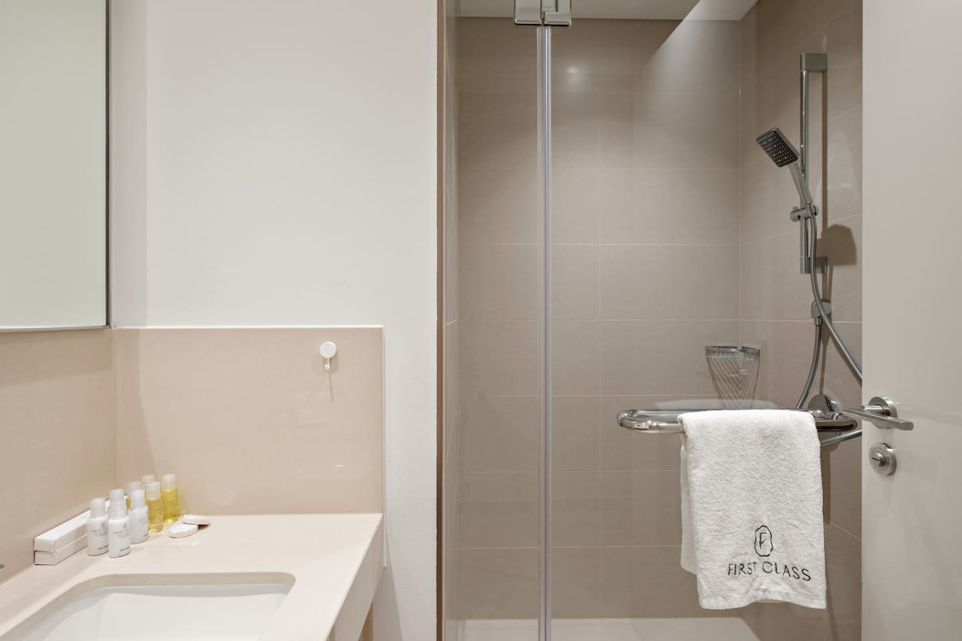 The bathroom is stocked with fresh towels and essential toiletries, so you don’t have to worry about bringing your own.