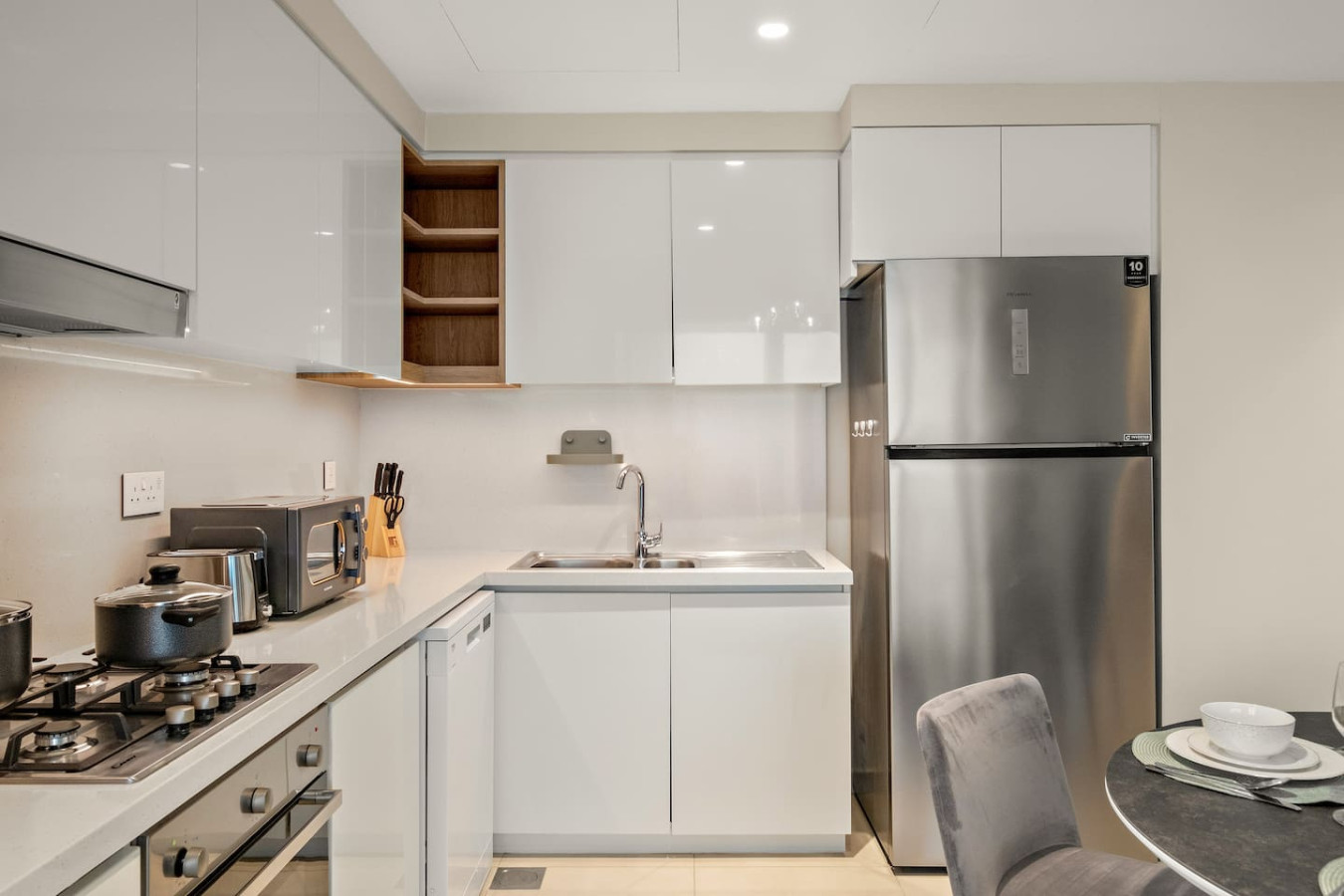 It is fully equipped with stainless-steel cooking appliances that make it suitable for preparing any meal, whether a simple breakfast, quick snack or a three-course gourmet dinner. Spacious quartz countertops and a central kitchen island provide plenty of room to work your MasterChef magic.