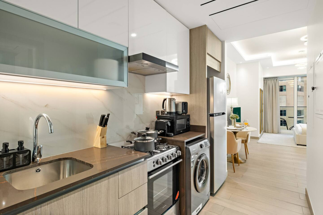 It is fully equipped with stainless-steel cooking appliances that make it suitable for preparing any meal, whether a simple breakfast, quick snack or a three-course gourmet dinner. Spacious quartz countertops and a central kitchen island provide plenty of room to work your MasterChef magic.