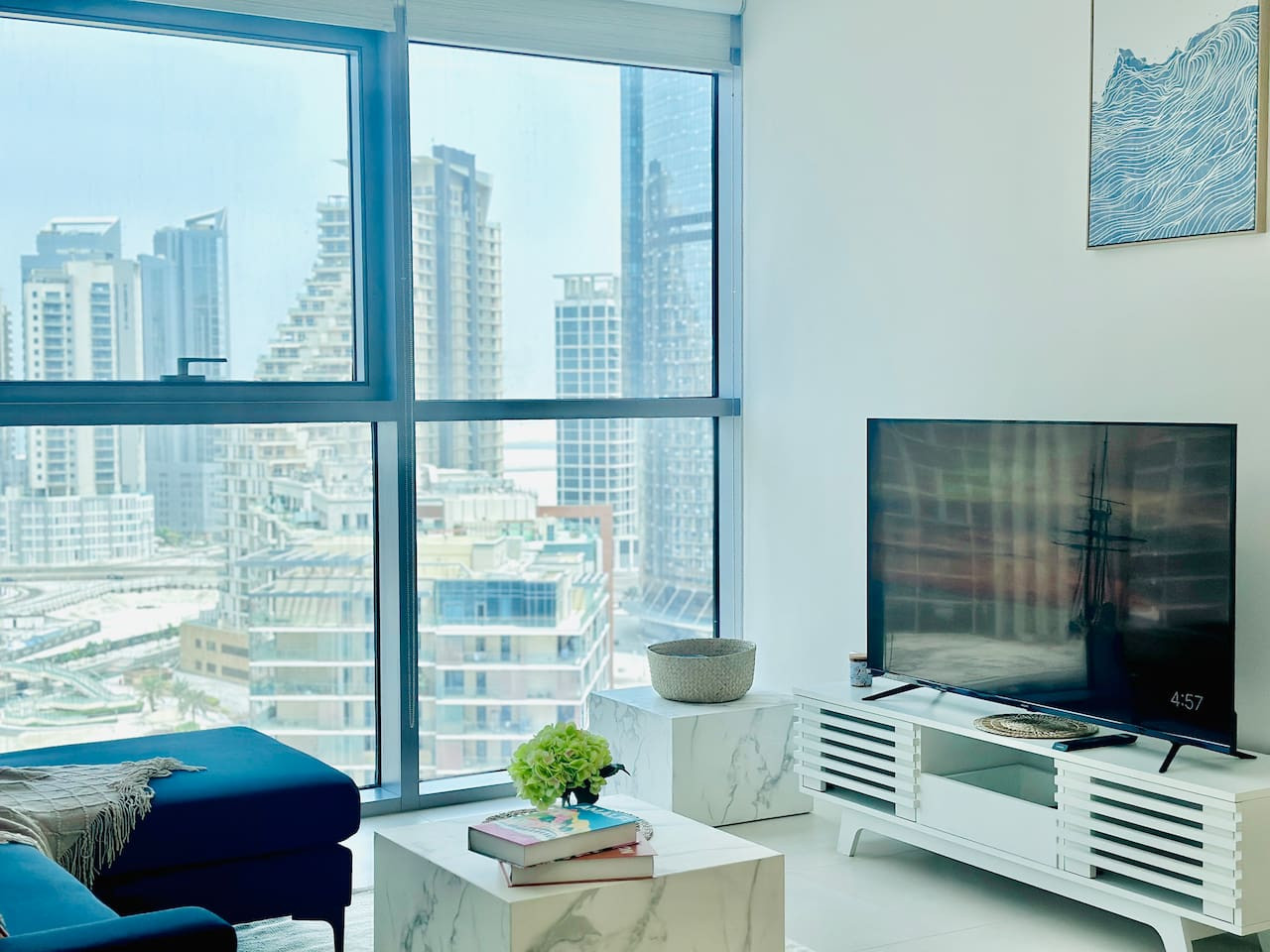 Living Area: A bright lounge with plush seating and a smart TV for relaxing evenings.
