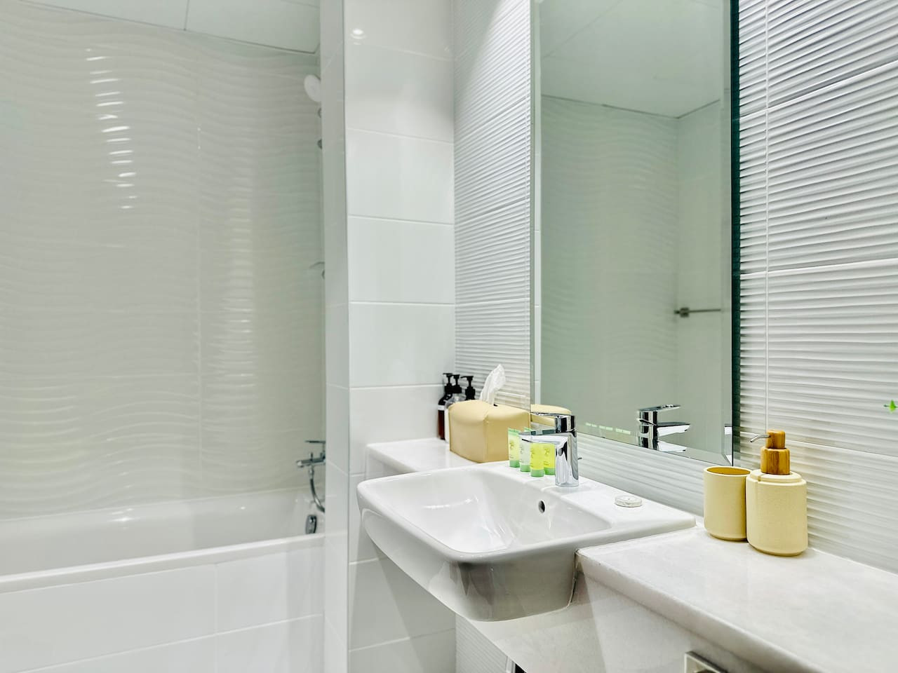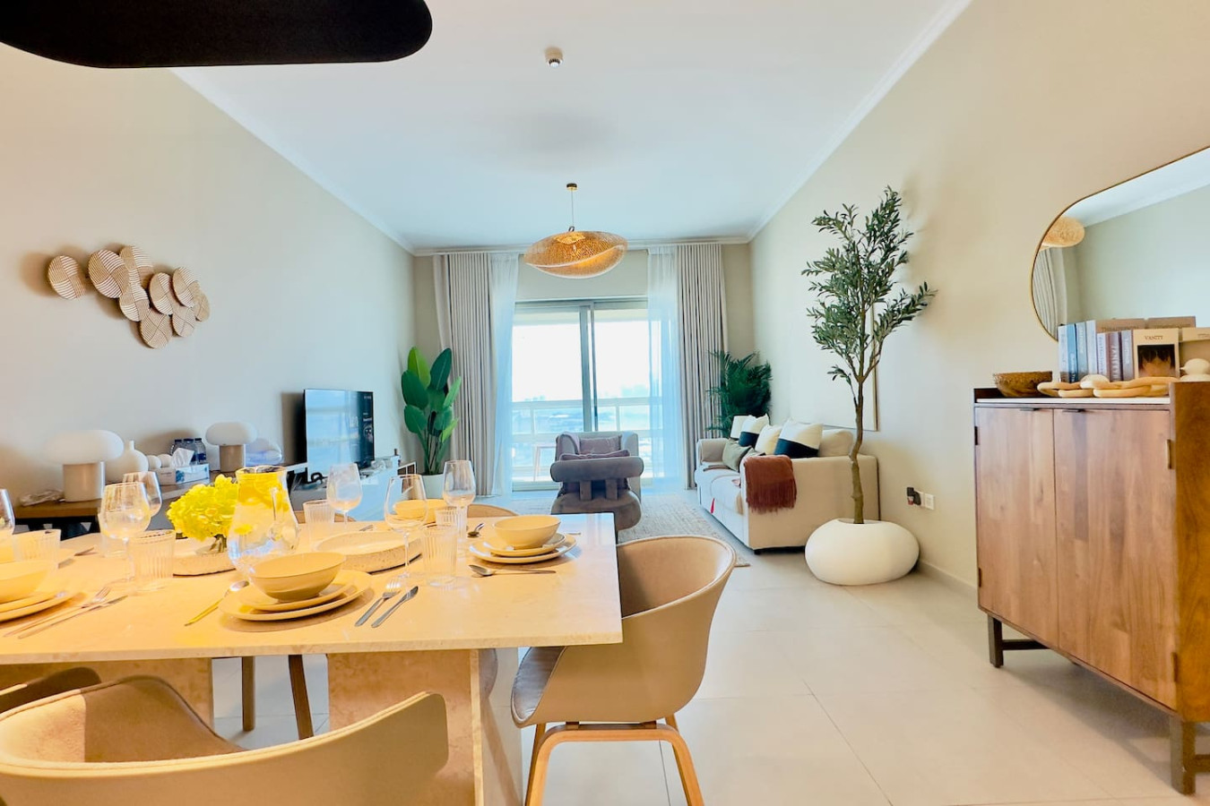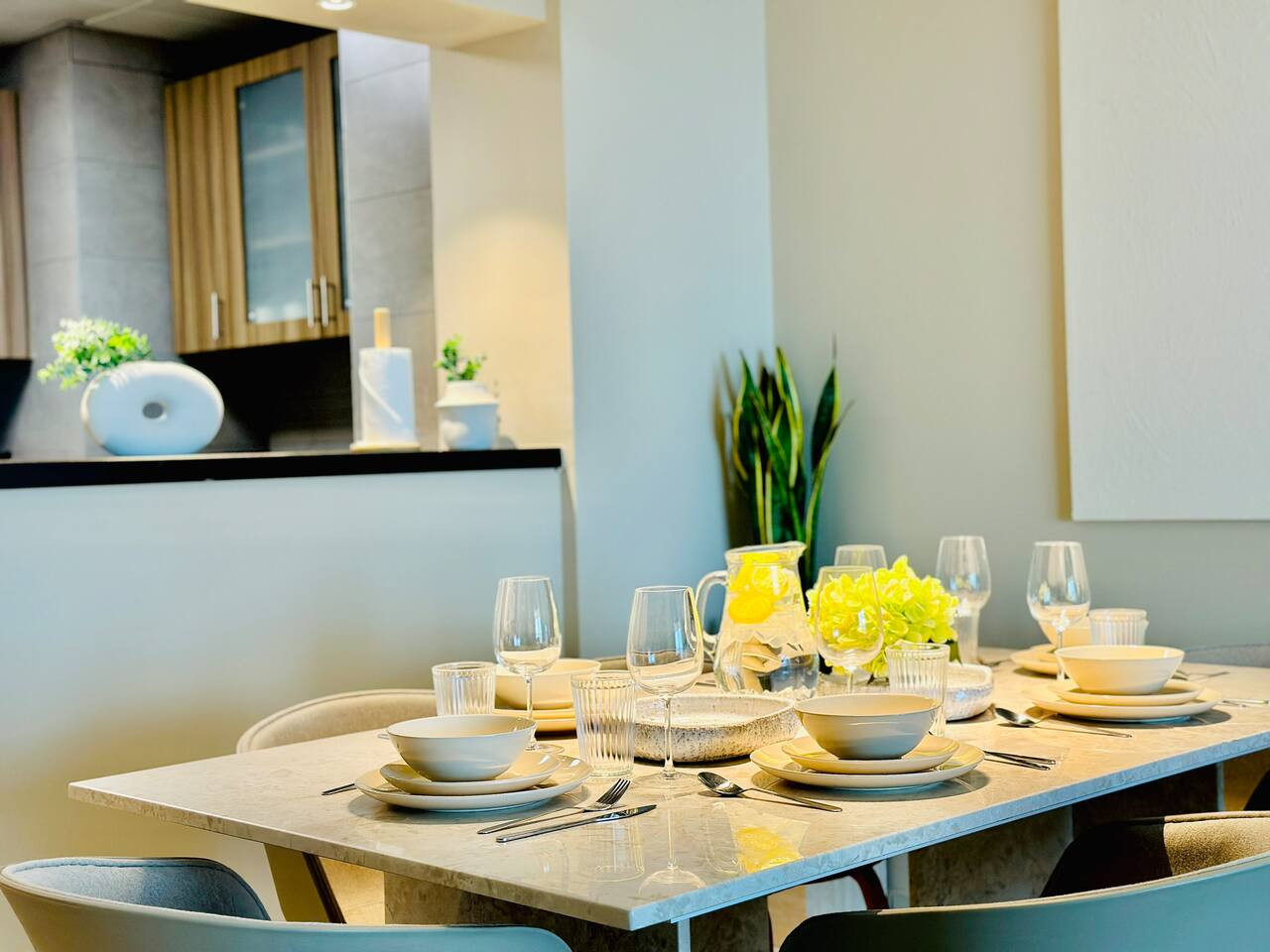 This thoughtfully designed apartment blends comfort with contemporary style. The open-plan living and dining area offers plenty of natural light, a Smart TV for your entertainment, and a fully equipped kitchen for your convenience. The bedroom features a comfortable bed with premium linens, ensuring a restful stay.